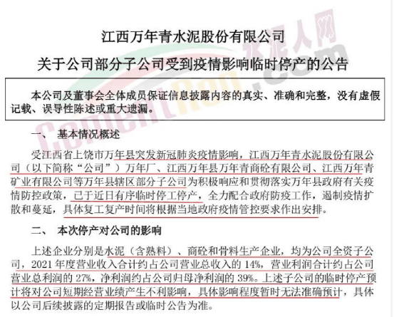 同期,上市公司万年青发公告称,受疫情影响,旗下多家子公司停工停产。停产所涉及的子公司占企业2021年度营业总收入的14%,营业利润约占总营业润的27%,净利润约占公司归母净利润的39%。临时停产将对公司短期经营业绩产生不利影响,具体影响程度暂时无法准确预计。