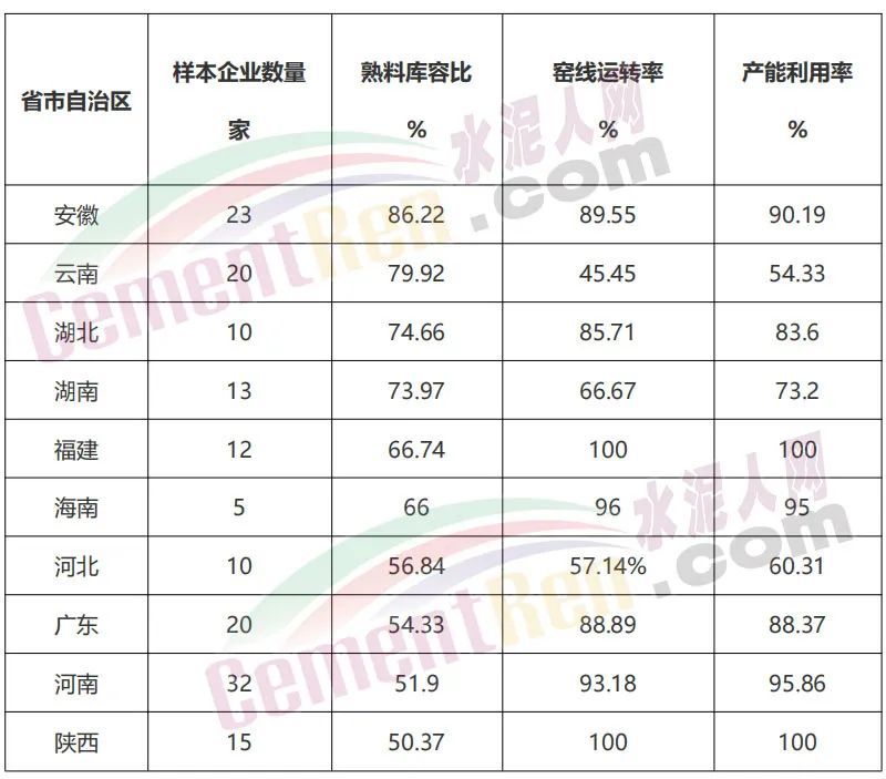 据水泥人网五月初调研数据显示,安徽、云南、湖北、湖南、福建、海南、河北、广东、河南、陕西等十余个省份,熟料库容比均在50%以上,其中安徽、云南等省份达到了80%左右。产能利用率方面仅福建和陕西达到了100%。