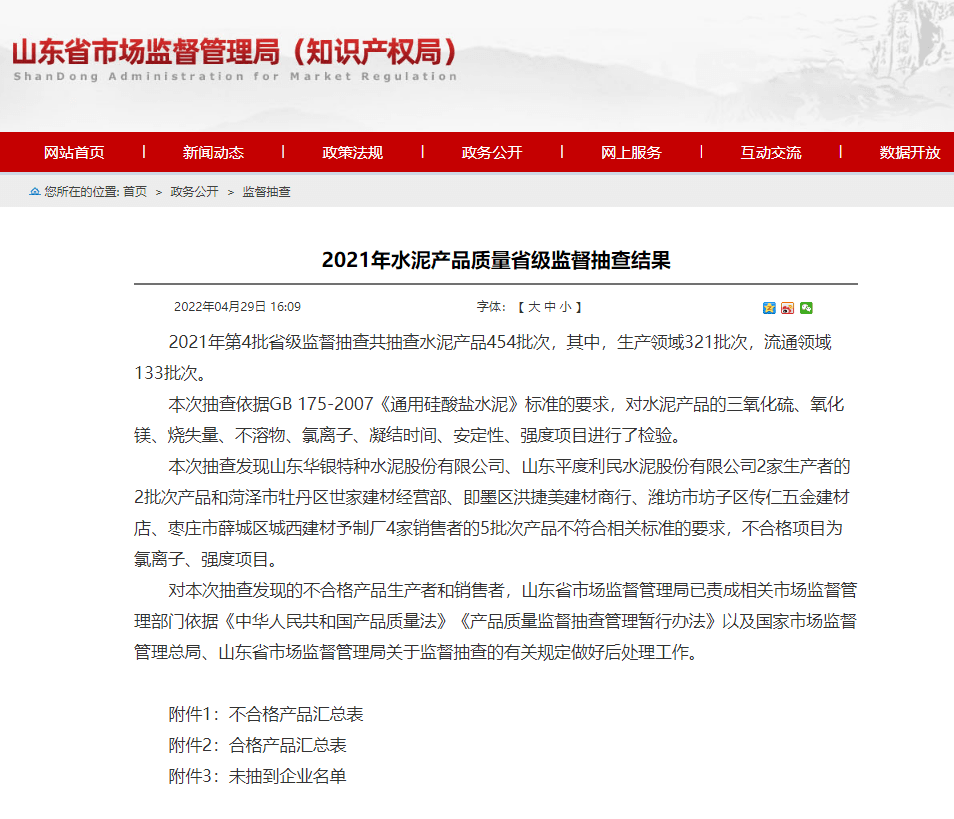 日前山东省市场监督管理局发布《2021年水泥产品质量省级监督抽查结果》称,2021年第4批省级监督抽查共抽查水泥产品454批次,其中,生产领域321批次,流通领域133批次。本次抽查依据GB 175-2007《通用硅酸盐水泥》标准的要求,对水泥产品的三氧化硫、氧化镁、烧失量、不溶物、氯离子、凝结时间、安定性、强度项目进行了检验。