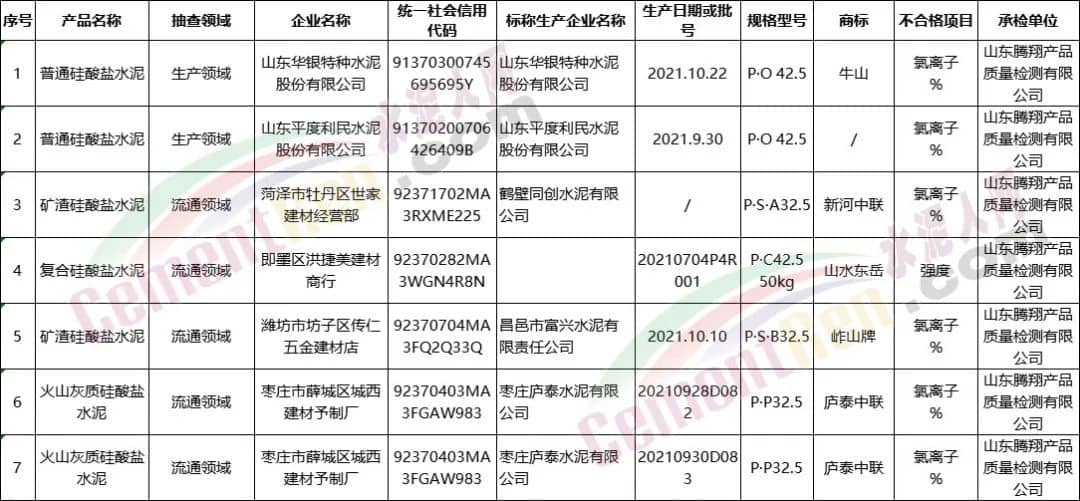 抽查发现山东华银特种水泥股份有限公司、山东平度利民水泥股份有限公司2家生产者的2批次产品和菏泽市牡丹区世家建材经营部、即墨区洪捷美建材商行、潍坊市坊子区传仁五金建材店、枣庄市薛城区城西建材予制厂4家销售者的5批次产品不符合相关标准的要求,不合格项目为氯离子、强度项目。