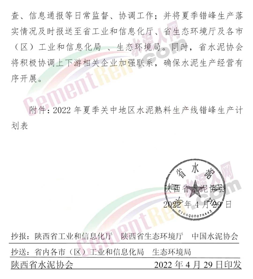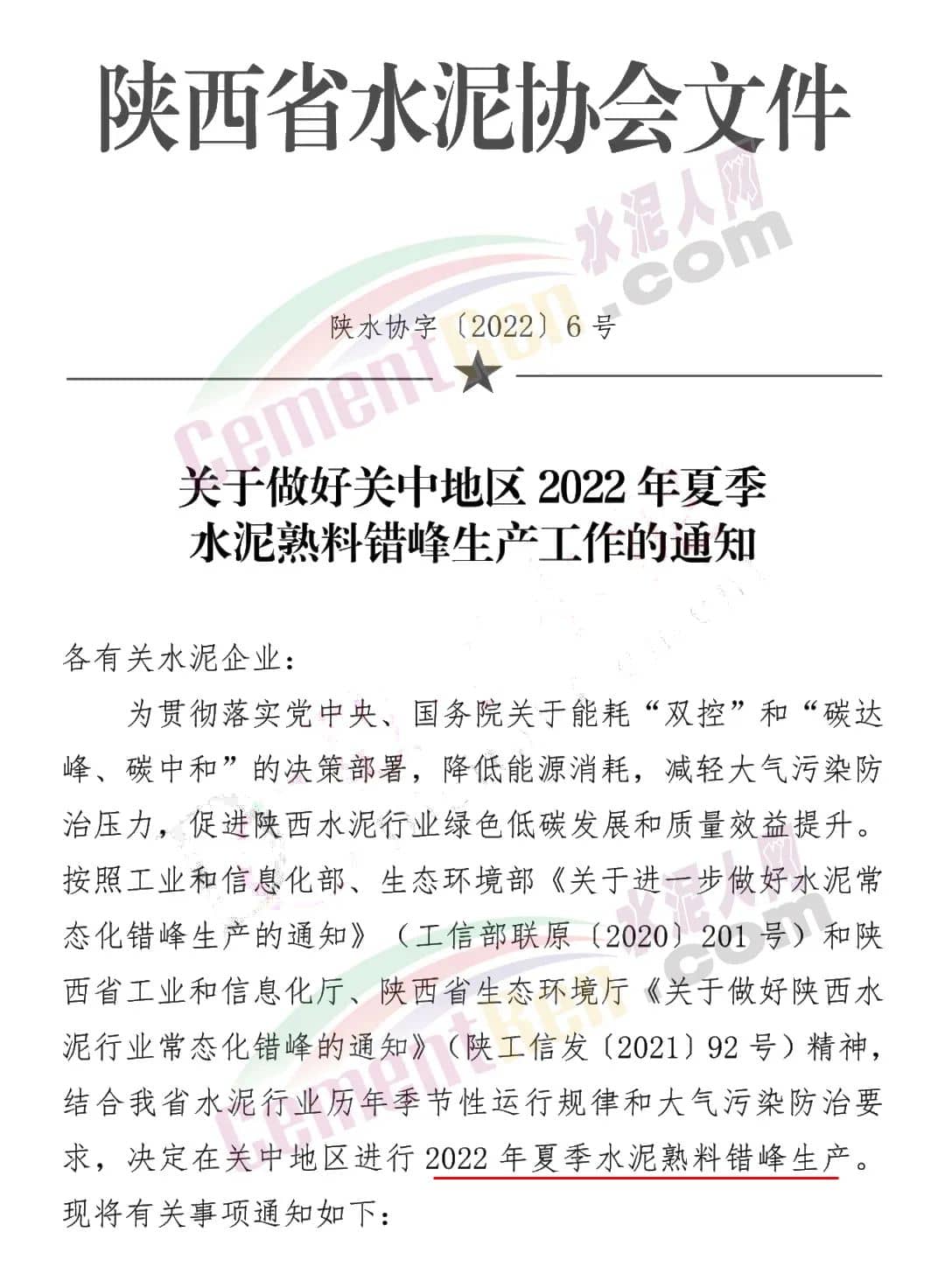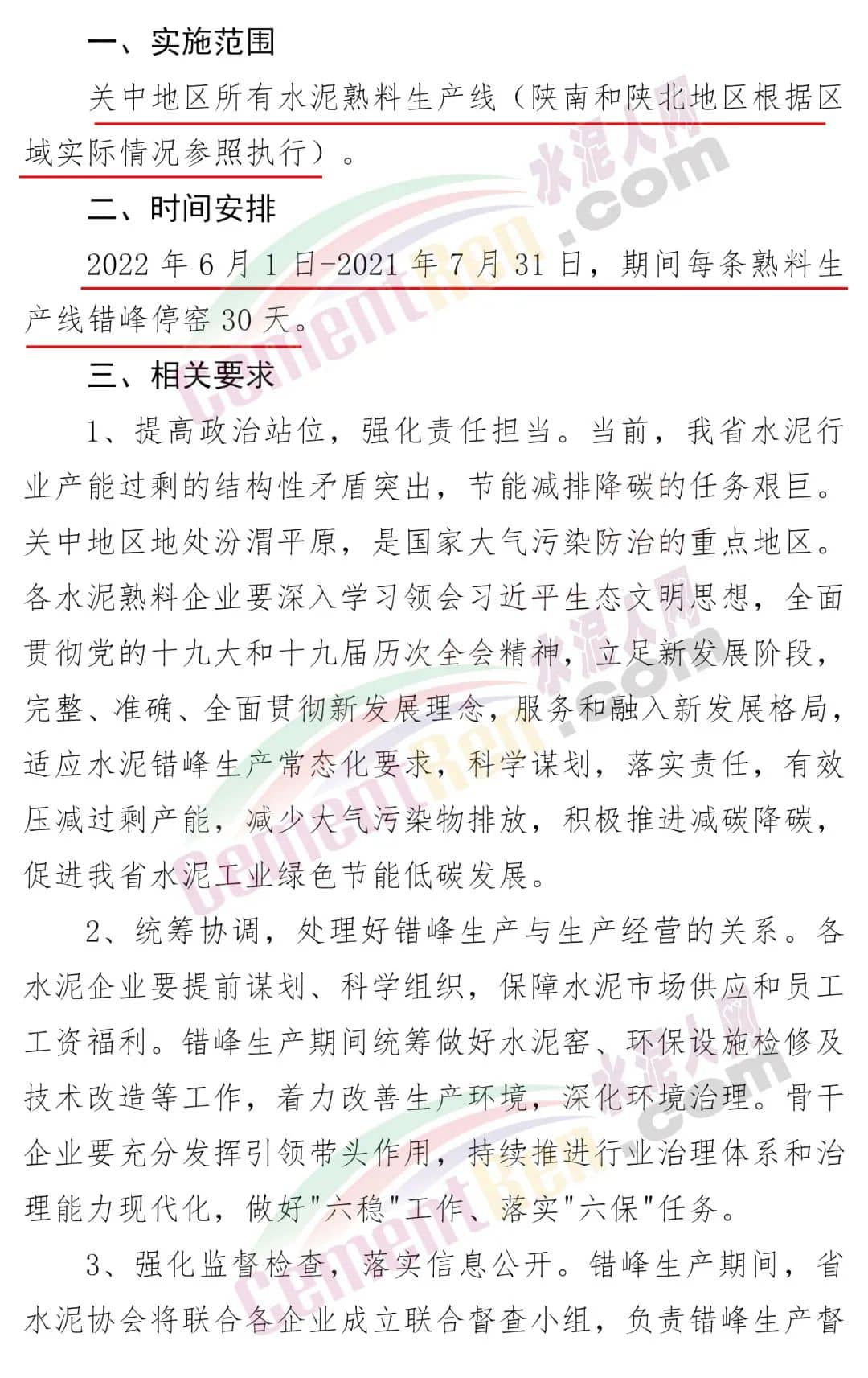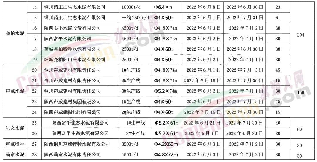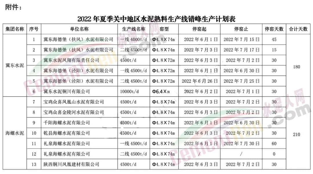 4月29日,陕西省水泥协会发布关于做好关中地区2022年夏季水泥熟料错峰生产工作的通知,要求关中地区所有水泥熟料生产线于2022年6月1日至7月31日期间错峰停窑30天/线。 水泥人网注意到,陕西关中海螺水泥、冀东水泥、尧柏水泥、声威水泥、生态水泥、声威特种、满意水泥等7家水泥企业,最长停窑210天,28条生产线合计共停窑864天;铜川两条万吨线分别于6月8日和6月2日开始停窑限产,尧柏水泥万吨线将于6月8日至6月30日期间停产23天。冀东水泥万吨线于6月2日至7月1日期间停产30天。