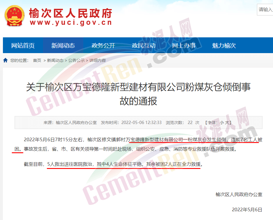 山西晋中榆次区人民政府消息:2022年5月6日7时15分左右,榆次区修文镇郭村万宝德隆新型建材有限公司一粉煤灰仓发生倾倒,造成7名工人被困。