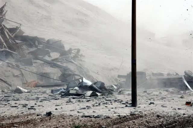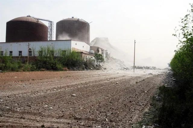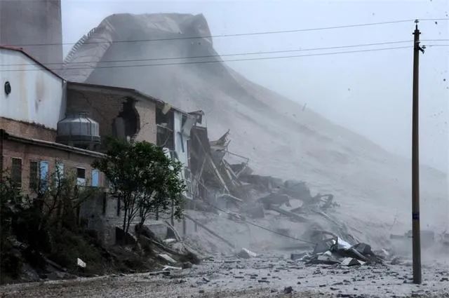 图片左侧为最先发生倾倒的粉煤灰仓