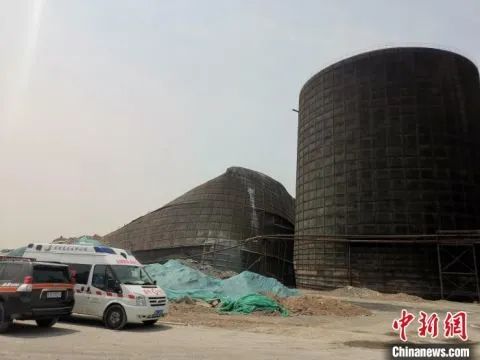 图为其中一个受损倾斜的罐体