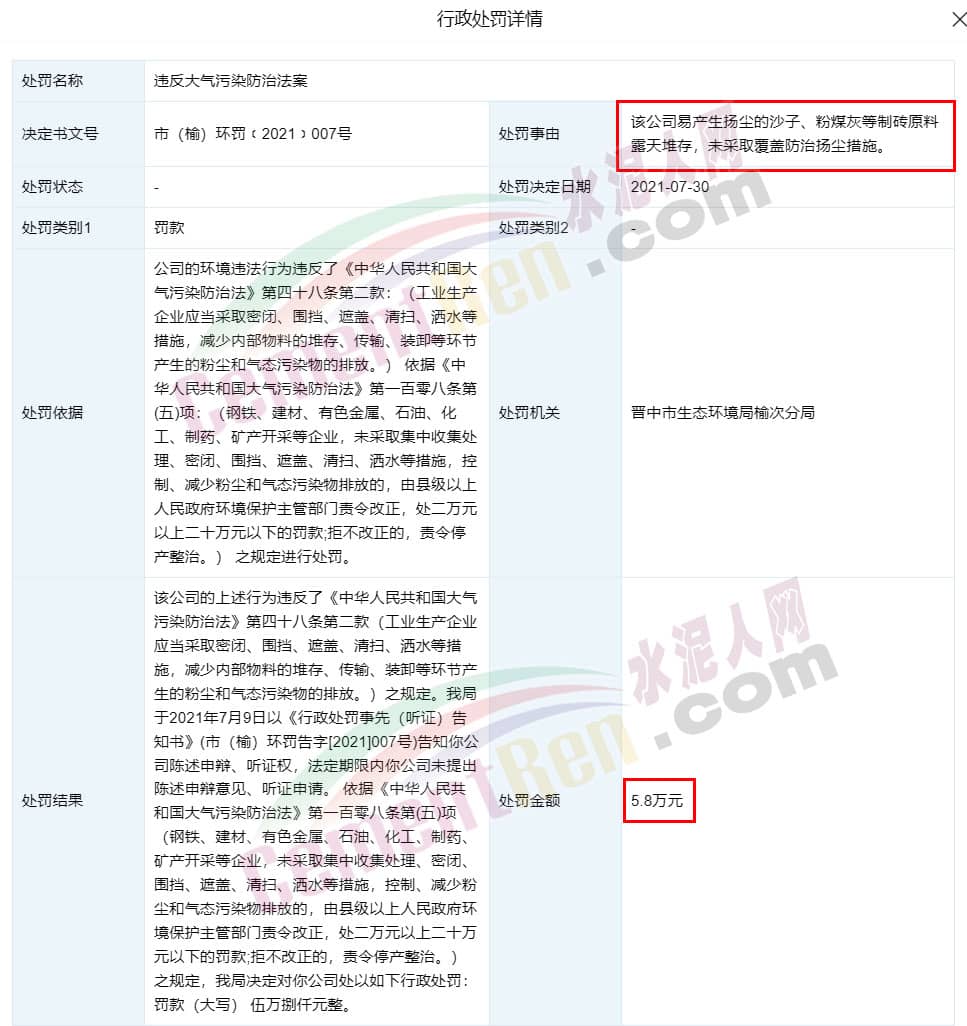 天眼查行政处罚信息显示,2021年7月30日,因易产生扬尘的沙子、粉煤灰等制砖原料露天堆存,未采取覆盖防治扬尘措施该马来被晋中市生态环境局榆次分局处以罚款5.8万元。