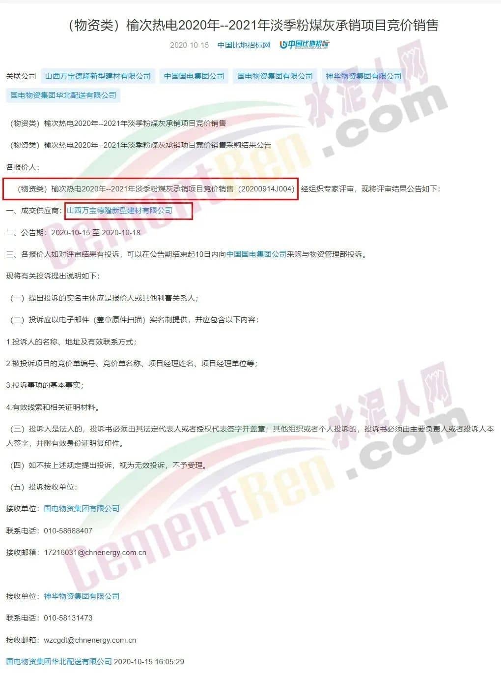 水泥人网注意到,这家企业曾中标中国国电集团有限公司榆次热电2020年--2021年淡季粉煤灰承销项目。