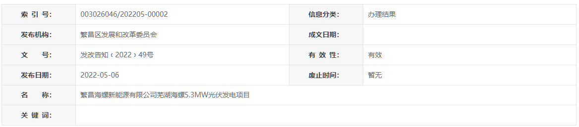 天眼查资料显示,繁昌海螺新能源有限公司成立于2020年12月,主要经营光伏、风电及储能领域的技术开发、服务和项目建设运营管理等,是安徽海螺新能源有限公司全资子公司。