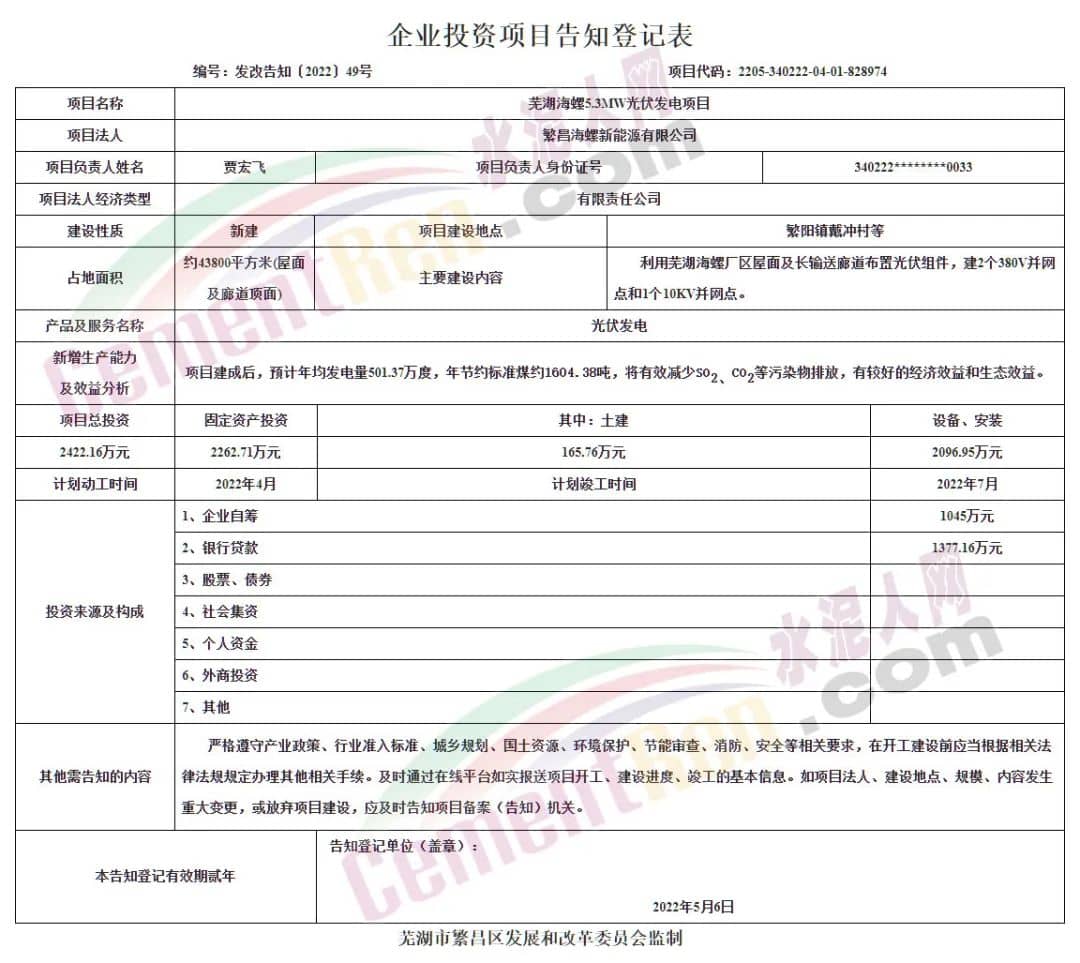 日前,芜湖市政府官网发布了《繁昌海螺新能源有限公司芜湖海螺5.3MW光伏发电项目企业投资项目告知书》。由繁昌海螺新能源有限公司投资建设的芜湖海螺5.3MW光伏发电项目成功获批。