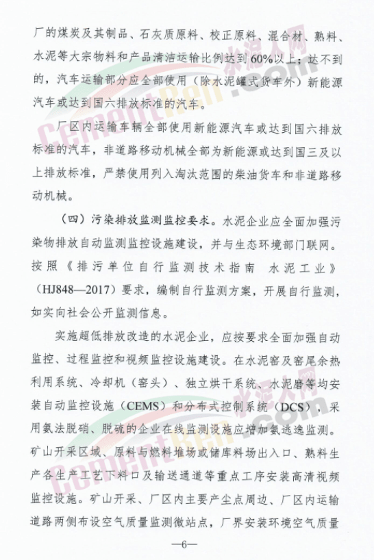 积极推动水泥企业采用铁路、水路、管道或带式输送机等清洁方式运输,进出厂的煤炭及其制品、石灰质原料、校正原料、混合材、熟料、水泥等大宗物料和产品清洁运输比例达到60%以上;达不到的,汽车运输部分应全部使用(除水泥罐式货车外)新能源汽车或达到国六排放标准的汽车。