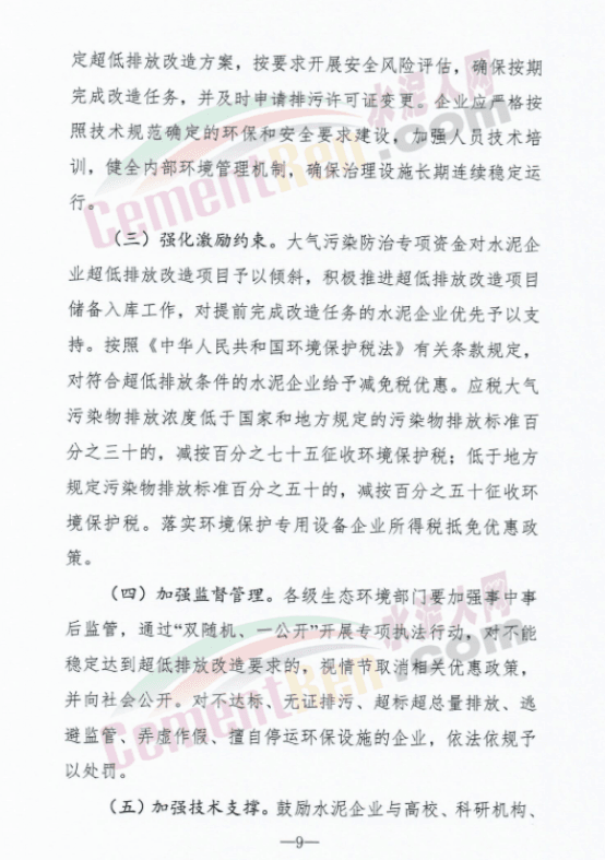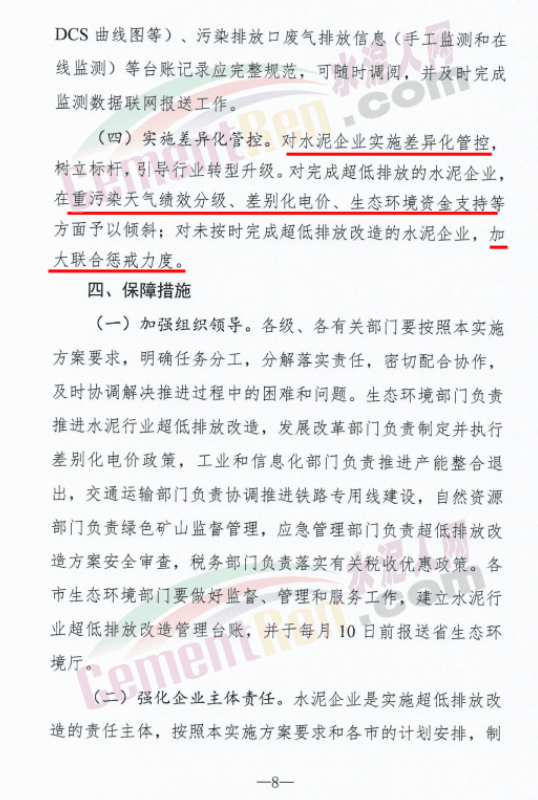对完成超低排放的水泥企业,在重污染天气绩效分级、差别化电价、生态环境资金支持等方面予以倾斜;对未按时完成超低排放改造的水泥企业,加大联合惩戒力度。