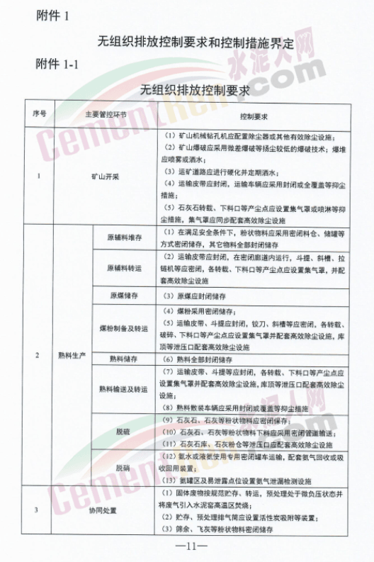 加强矿山开采扬尘控制,所有水泥矿山达到《非金属矿绿色矿山建设规范》(DB37/T3843-2019)建设要求,矿山机械钻孔机应配置除尘器或其他有效除尘设施。提高物料储存环节扬尘控制能力,粉状物料全部密闭储存,其他物料全部封闭储存。强化物料输送过程扬尘防控,物料采用封闭式皮带、斗提、斜槽运输,散状原燃料卸车、上料、配料、输送在确保安全的情况下密闭作业。提升生产工艺过程烟粉尘排放治理水平,熟料厂熟料散装、包装车间以及粉磨站破碎机、辊压机、磨机全封闭。无组织排放控制要求及措施的界定。