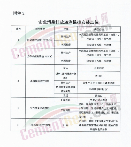 水泥企业应全面加强污染物排放自动监测监控设施建设,并与生态环境部门联网。按照《排污单位自行监测技术指南水泥工业》(HJ848-2017)要求,编制自行监测方案,开展自行监测,如实向社会公开监测信息。