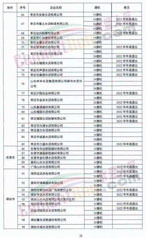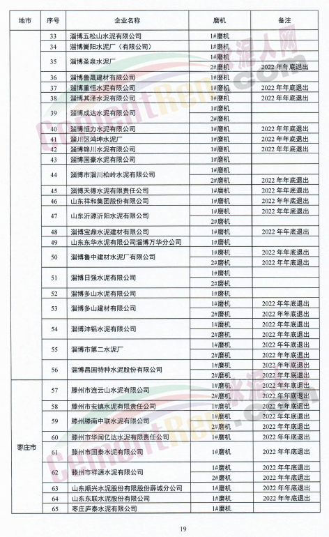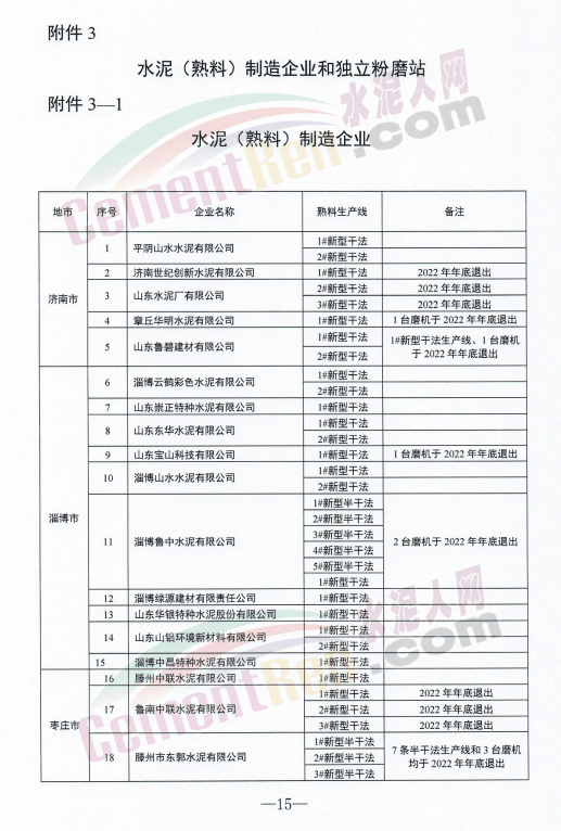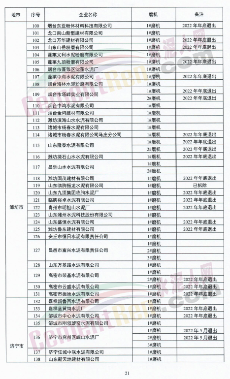 水泥熟料生产企业退出项目共包括16条新型干法水泥熟料生产线,其中13条于2022年底前退出,3条于2023年底前退出,7条半干法生产线于2022年底前退出;9台水泥磨机于2022年底前退出;
