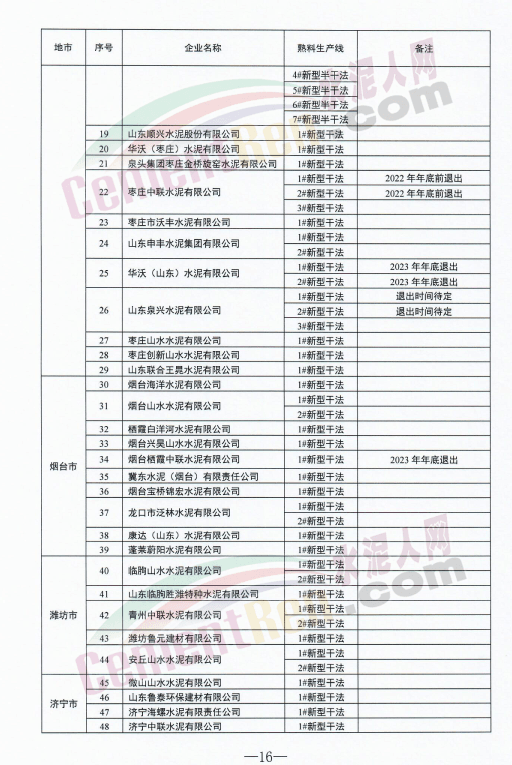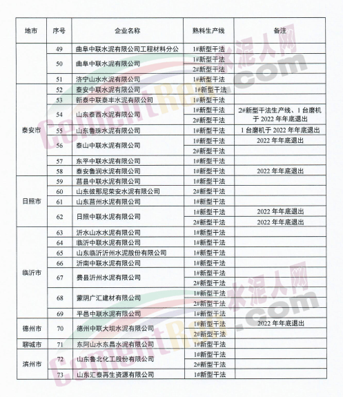 山东泉兴水泥有限公司两条新型干法水泥熟料生产线退出时间标注为“待定”。