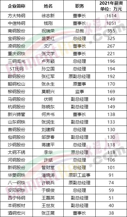 从2021年薪酬中可见,77位高管中华新水泥李叶青总裁年薪604万元为年薪相对较高的一位。但是相比钢铁行业的薪酬却显得有些捉襟见肘。上市钢企2021年薪酬最高的高管明细可见,方大特徐志新董事长年薪1614万元,高出李叶青总裁1009.97万元。