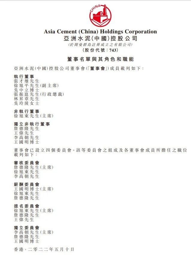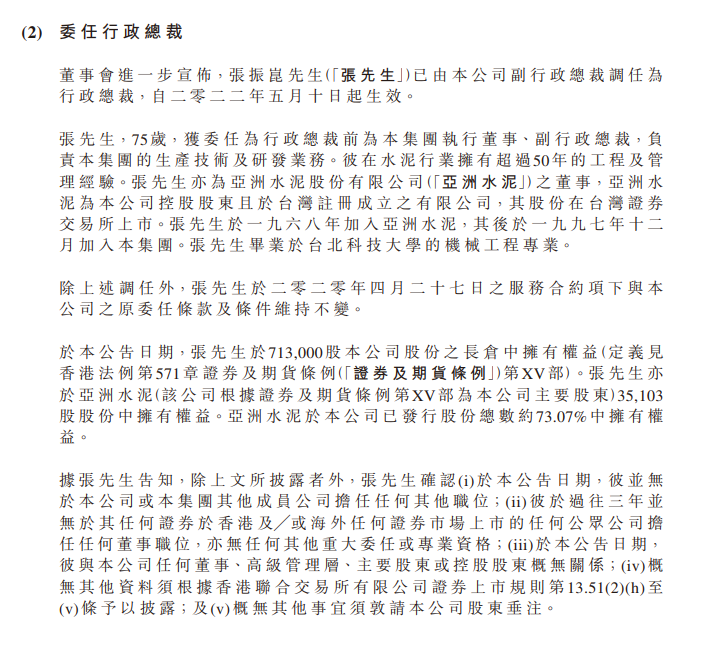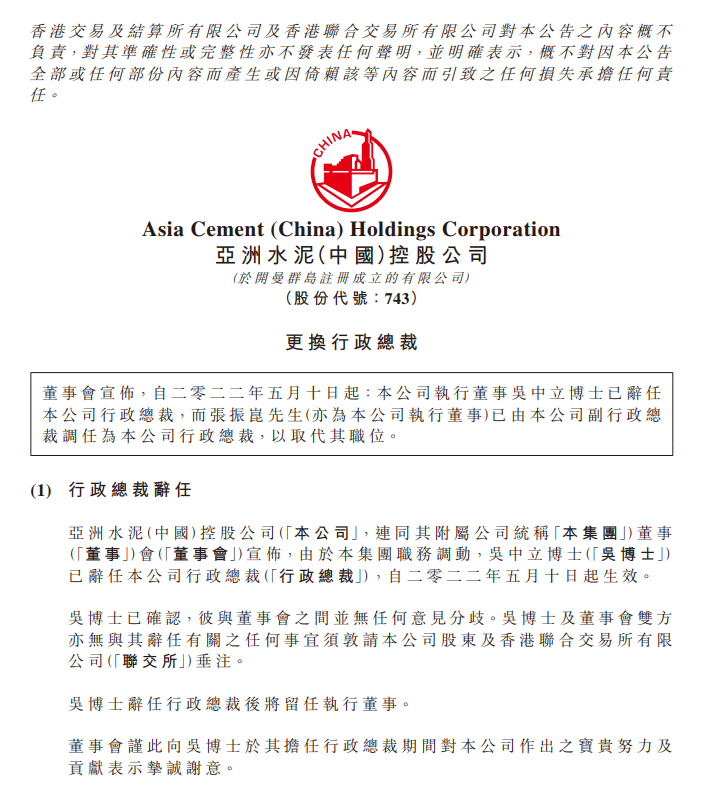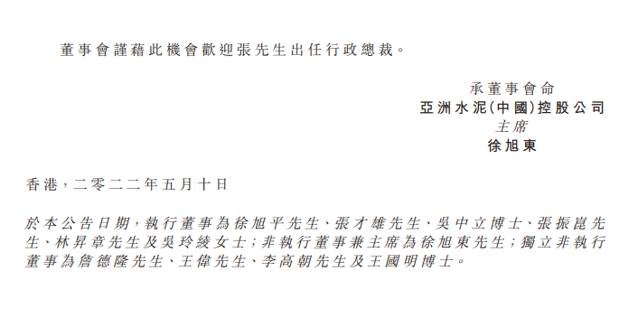 亚洲水泥(中国)发布公告,自2022年5月10日起:公司执行董事吴中立博士已辞任公司行政总裁,而张振昆先生(亦为公司执行董事)已由公司副行政总裁调任为公司行政总裁,以取代其职位。