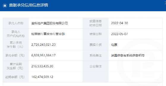 金科地产集团股份有限公司依然在逾期名单之中,查询金科地产4月末商票累计逾期金额达2.17亿元,月末逾期余额为1.62亿元,金额较3月有所扩大。