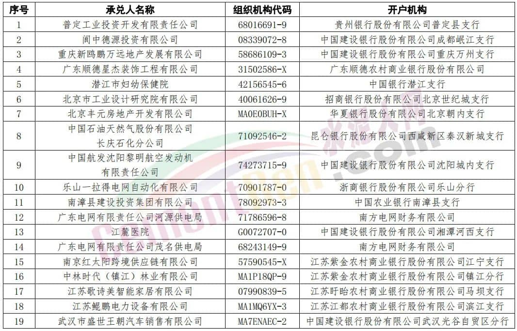 19家企业承兑人信息与工商登记信息不一致,或存在假冒商票问题