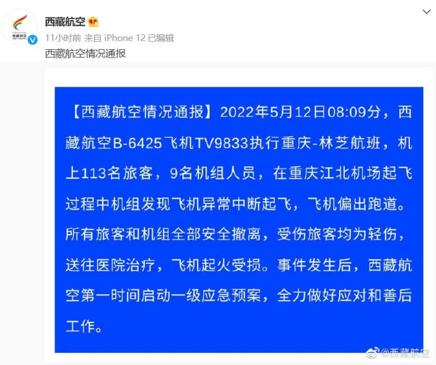 事件发生后,西藏航空发布情况通报称,机上113名旅客和9名机组人员全部安全撤离,受伤旅客均为轻伤,送往医院救治。西藏航空第一时间启动一级应急预案,全力做好应对和善后工作。