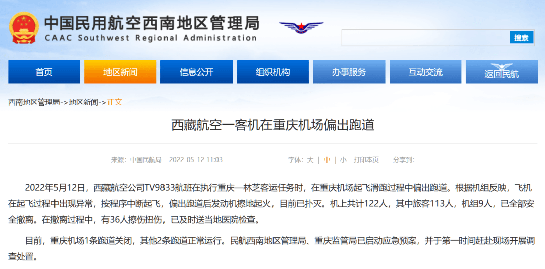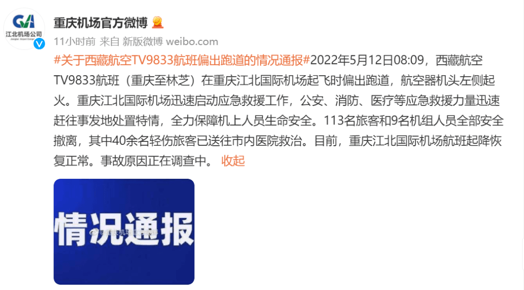 10时许,重庆机场官方微博通报:2022年5月12日08:09,西藏航空TV9833航班(重庆至林芝)在重庆江北国际机场起飞时偏出跑道,航空器机头左侧起火。重庆江北国际机场迅速启动应急救援工作,公安、消防、医疗等应急救援力量迅速赶往事发地处置特情,全力保障机上人员生命安全。