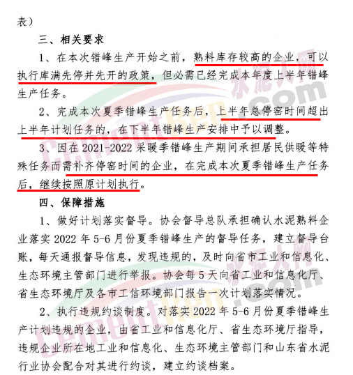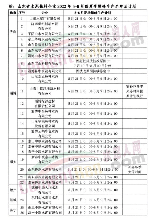 实施时间为2022年5月21日0:00-6月9日24:00,时间20天。实施对象为山东省水泥熟料企业的熟料生产线(含特种熟料生产线和建通窑、不含山东鲁北化工股份有限公司和山东汇泰再生资源有限公司的化工配套熟料生产线)。