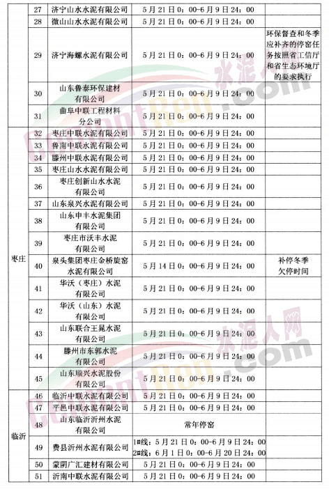 5 费县沂州水泥有限公司1#线:5月21日0:00-6月9日24:00;2#线:6月1日0:00-6月20日24:00