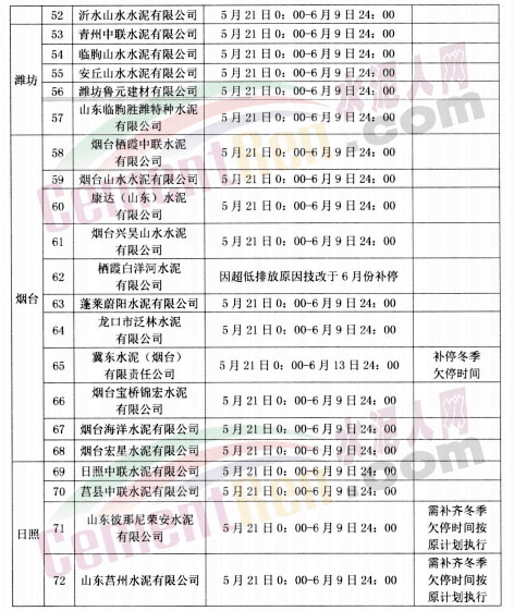 6 山东彼那尼荣安水泥有限公司需补齐冬季欠停时间按原计划执行。