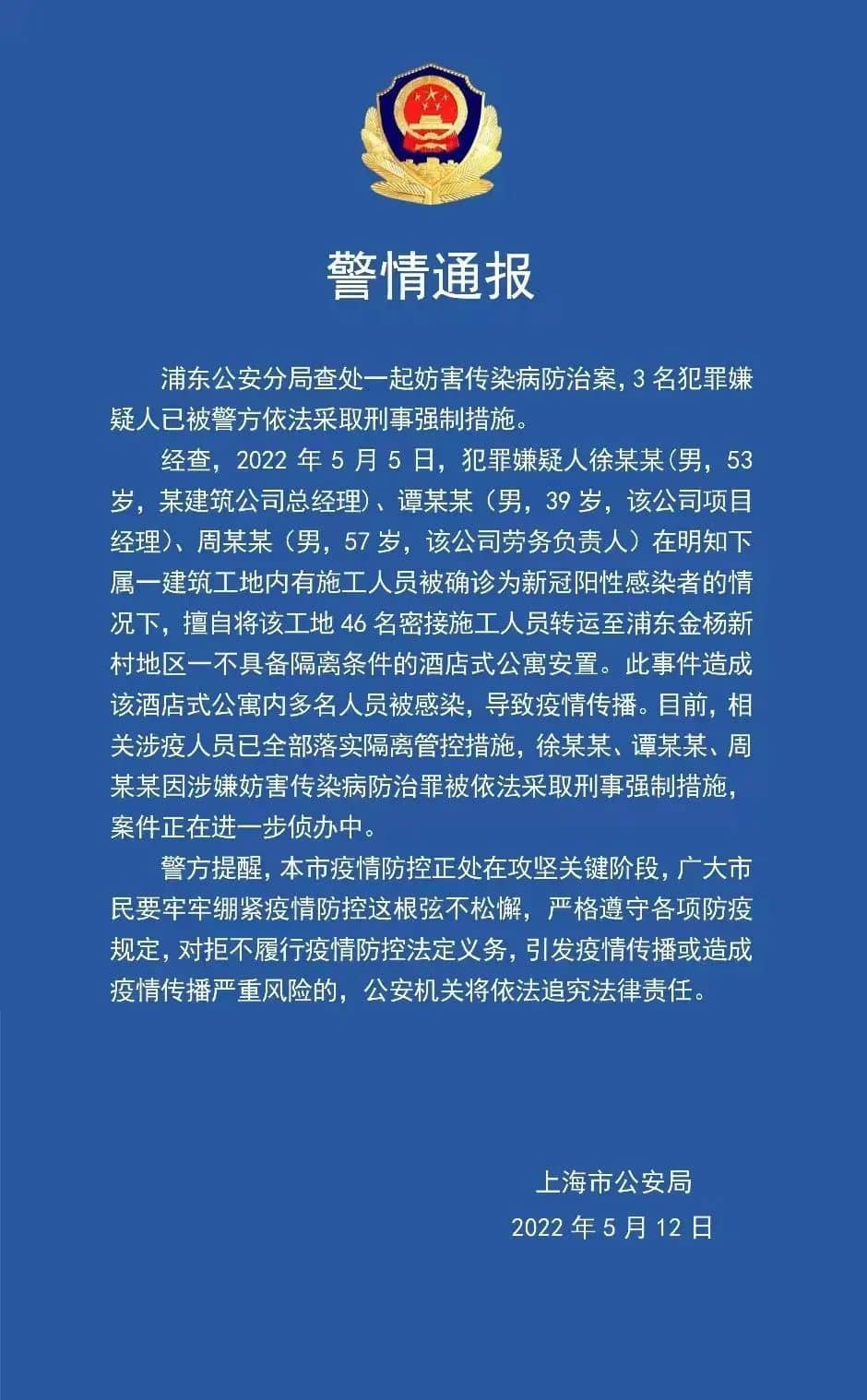 日前,上海市公安局发布一则警情通报称,浦东公安分局查处一起妨害传染病防治案,3名犯罪嫌疑人已被警方依法采取刑事强制措施。