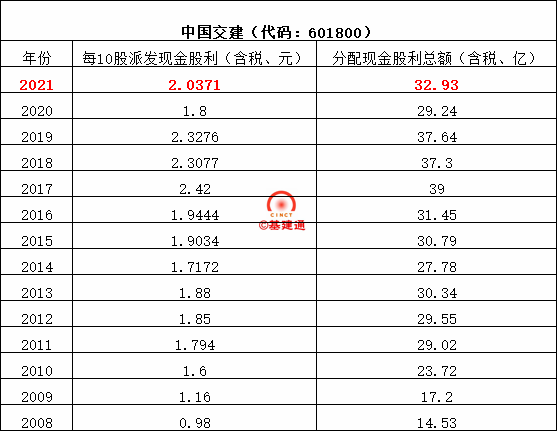 中国交建2021年度归属于公司股东的净利润为179.93亿元,同比增长11.03%。每股收益为 1.02元,拟每10股派现金股息约为2.04元。现金分红的数额(含税)为32.93亿,占合并报表中归属于上市公司普通股股东的净利润的20%。