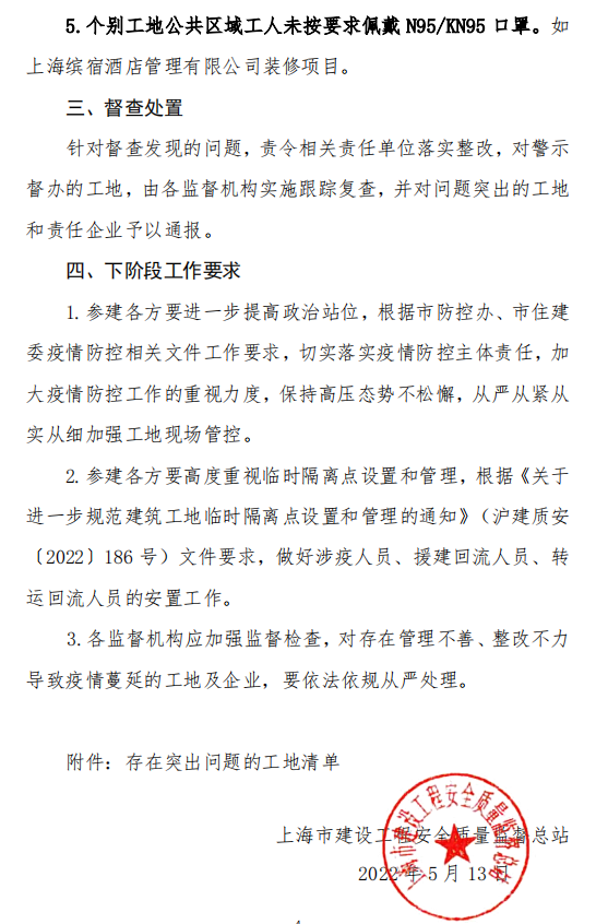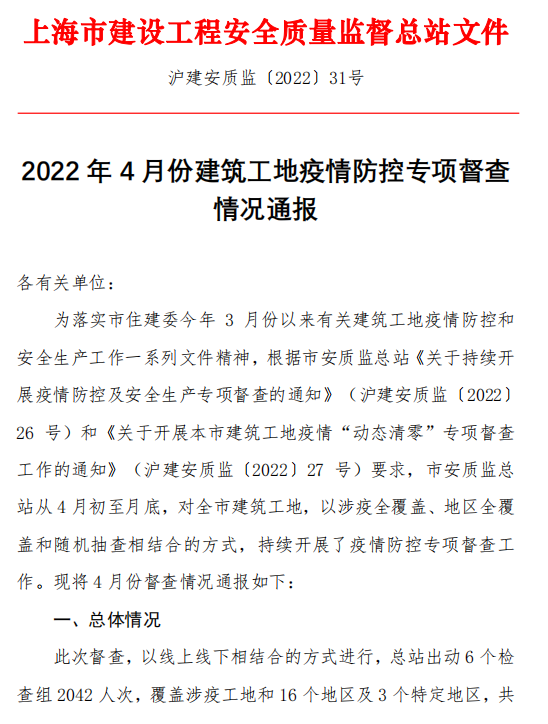 5月13日,上海市安质监总站发布《2022年4月份建筑工地疫情防控专项督查情况通报》称,为落实市住建委3月份以来有关建筑工地疫情防控和安全生产工作一系列文件精神,根据相关文件要求,市安质监总站从4月初至月底,对全市建筑工地,以涉疫全覆盖、地区全覆盖和随机抽查相结合的方式,持续开展了疫情防控专项督查工作。 此次督查,以线上线下相结合的方式进行,总站出动6个检查组2042人次,覆盖涉疫工地和16个地区及3个特定地区,共计督查工地971个次(含复查)。