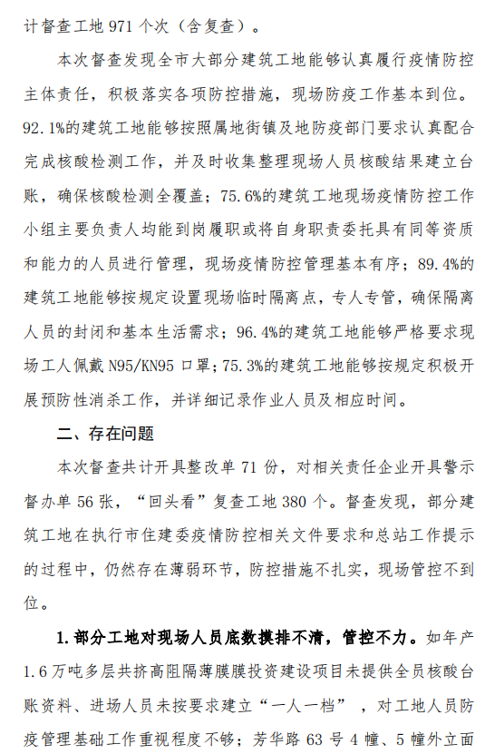 本次督查共计开具整改单71份,对相关责任企业开具警示督办单56张,“回头看”复查工地380个。督查发现,部分建筑工地在执行市住建委疫情防控相关文件要求和总站工作提示的过程中,仍然存在薄弱环节,防控措施不扎实,现场管控不到位。