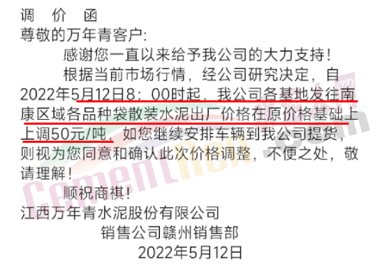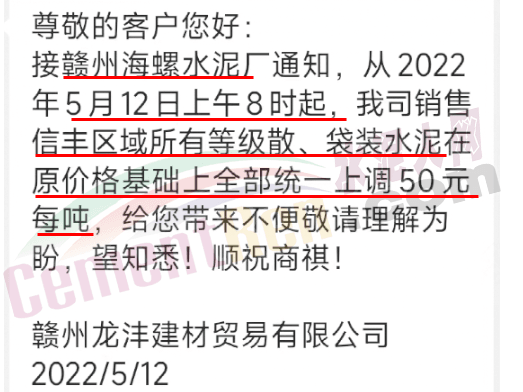 5月10日弋阳海螺水泥、江西万年青,对上饶所有袋散水泥价格上调50元/吨。