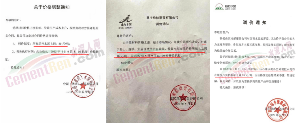 5月9日川渝地区多家企业水泥及熟料价格上调50元/吨。