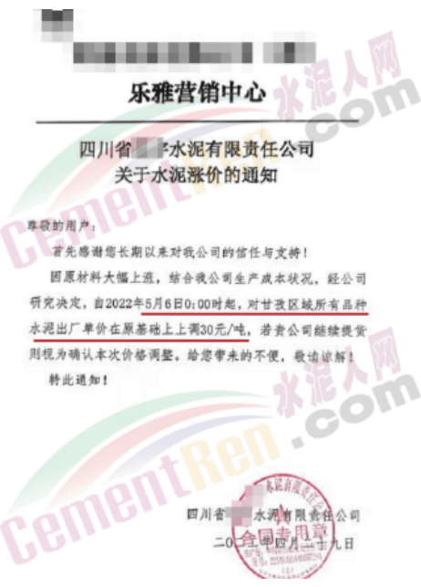 5月6日四川某水泥企业通知,对甘孜区域所有品种水泥出厂价上调30元/吨。
