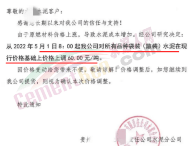 5月1日贵州部分水泥企业上调水泥60元/吨。