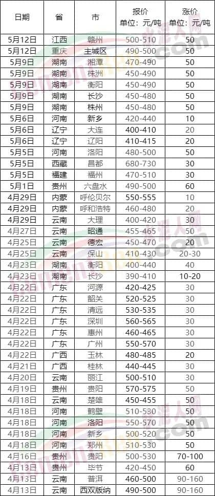 从上述数据可见,除云南普洱、西双版纳区域4月13日通知一次性上调160元/吨外,贵州贵阳区域4月16、19日两轮上调水泥价格,累计上调120-150元/吨,也超过了100元/吨。目前主流品牌P.O42.5散装水泥报530元/吨左右。