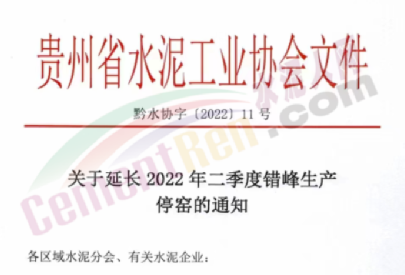 贵州省水泥工业协会发布《关于延长2022年二季度错峰生产停窑的通知》要求贵州区域所有水泥熟料生产线二季度每条生产线精准错峰生产共计45天。