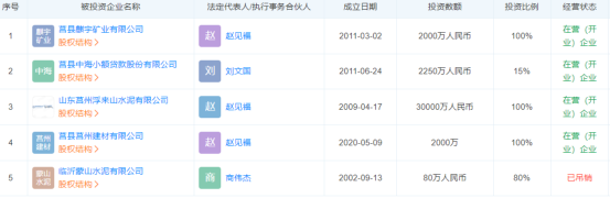 企业对外投资五家企业,其中莒县麒宇矿业有限公司、莒县中海小额贷款股份有限公司、山东莒州浮来山水泥有限公司、莒县建材有限公司四家尚在正常营业。企业对莒县麒宇矿业有限公司、山东莒州浮来山水泥有限公司、莒县建材有限公司为100%控股,莒县中海小额贷款股份有限公司持股15%。