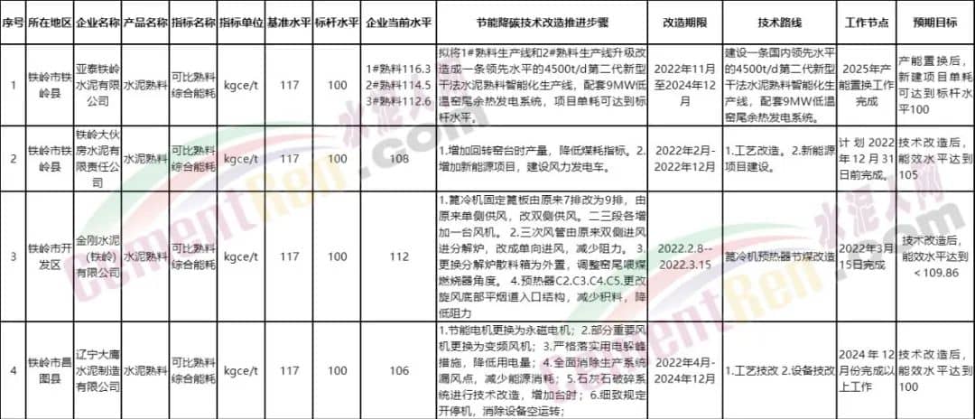 亚泰集团铁岭水泥有限公司建设一条4500t/d第二代新型干法水泥熟料智能化生产线,配套9MW低温窑尾余热发电系统项目,到2025年末实现企业能耗达到标杆水平。
