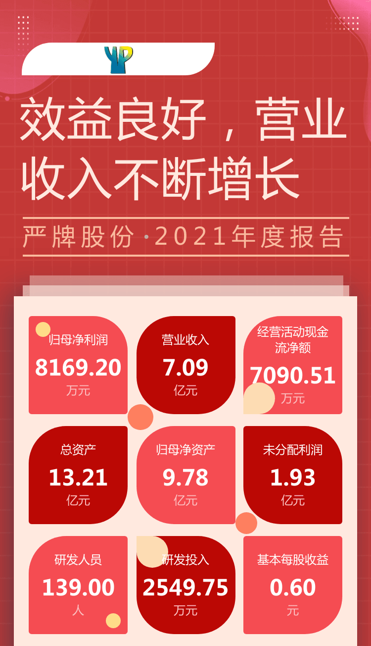 2021年度,公司实现营业总收入7.09亿元,同比增长23.83%;实现属于上市公司股东的净利润0.82亿元;每股收益0.60元。