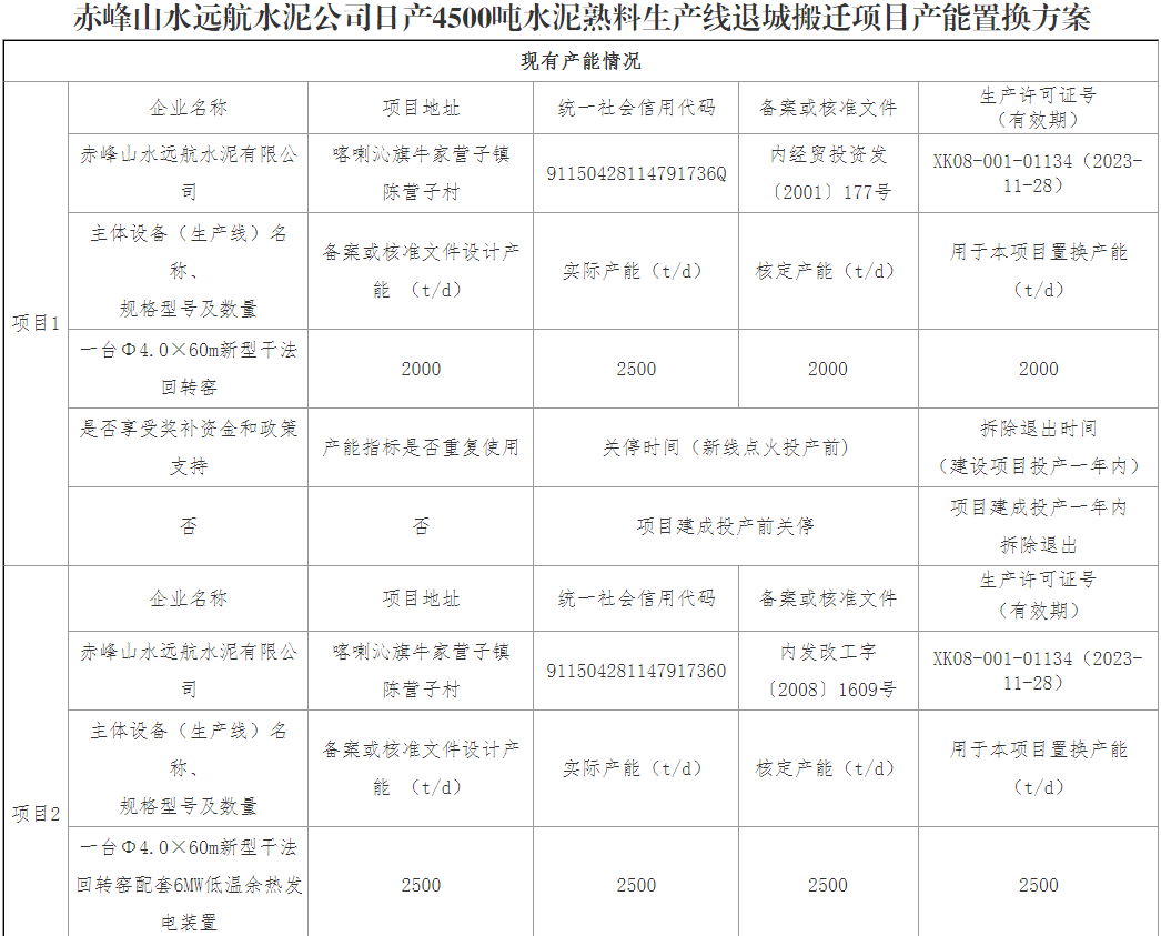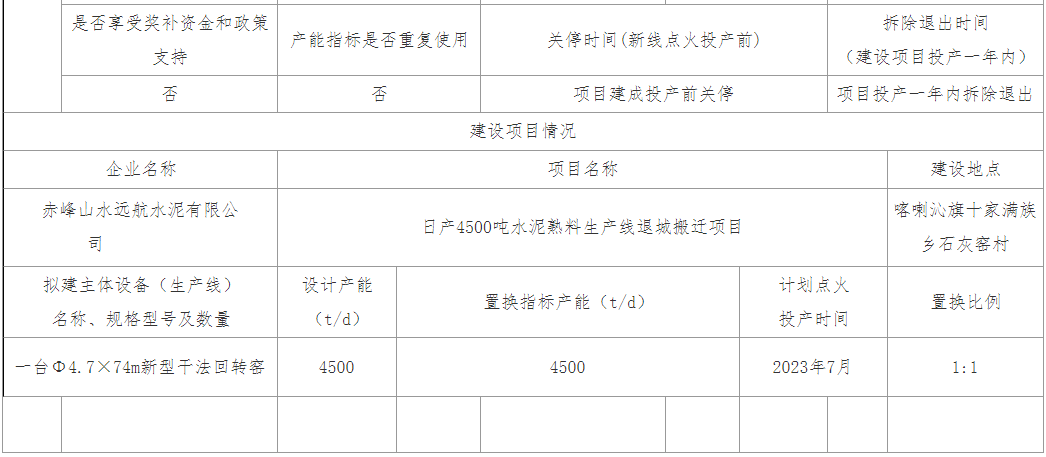 据了解,2021年3月内蒙古工信厅发布关于赤峰山水远航水泥有限公司日产4500吨水泥熟料生产线退城搬迁项目产能置换方案的公示,内容显示,赤峰山水远航水泥有限公司拟整合现有1条日产2500吨干法窑水泥生产线、1条日产2000吨干法窑水泥生产线,等量置换在喀喇沁旗十家满族乡石灰窑村建设1条日产4500吨水泥熟料生产线。项目计划于2023年7月点火投产。