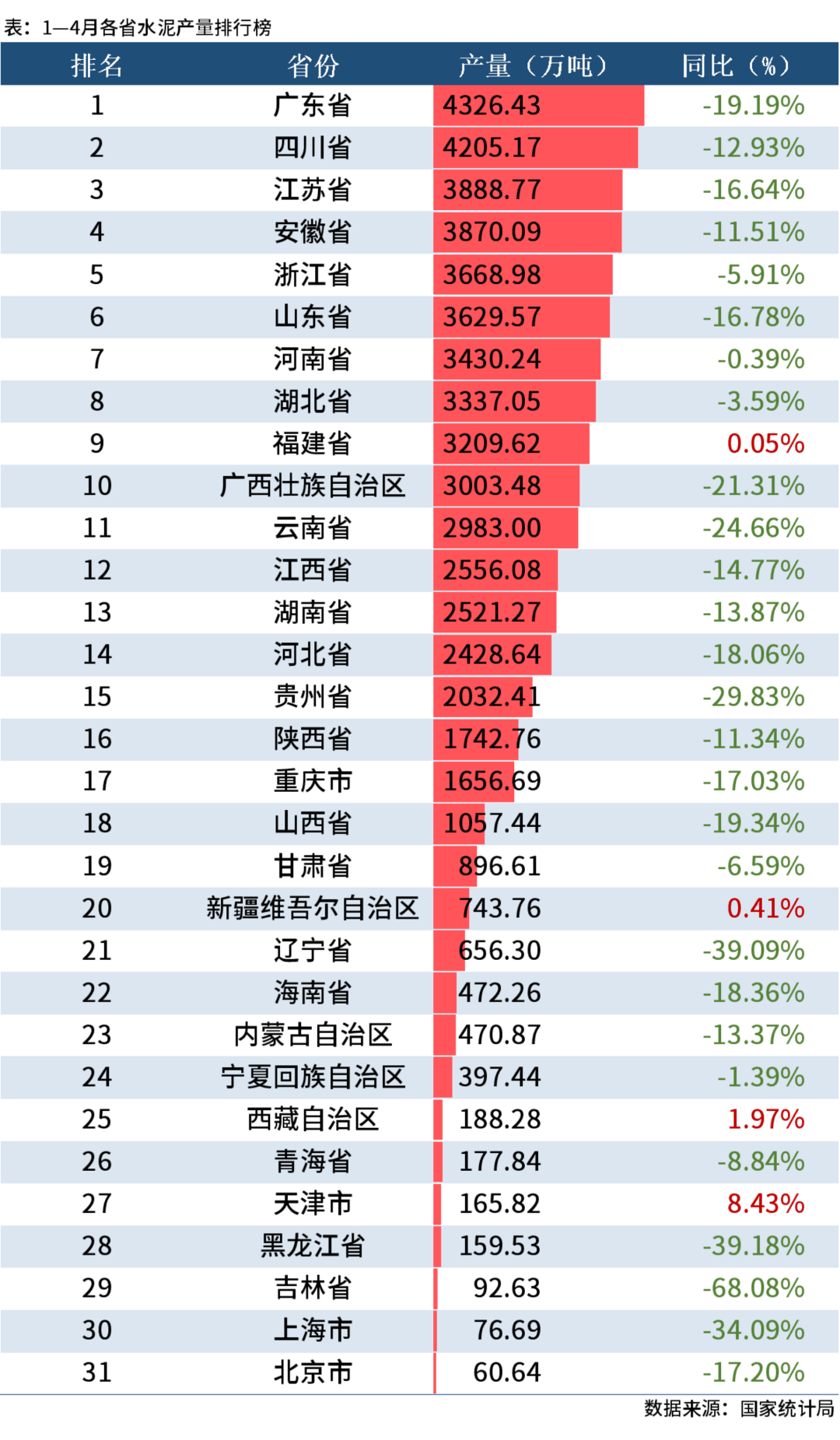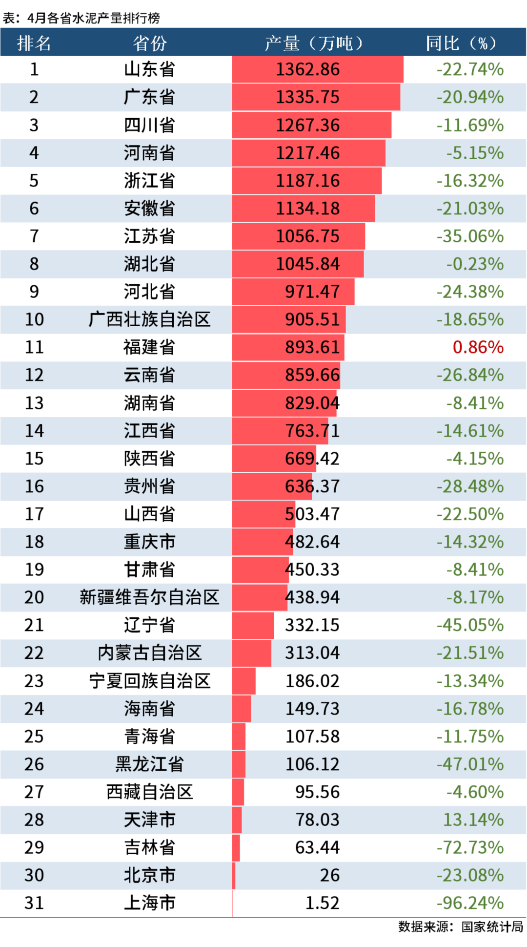 从分省数据来看,30省数市产量均有不同程度的下降,仅有福建省小幅增长0.86%。其中,4月全国14个省市水泥产量同比降幅超20%,上海降96.24%、吉林降72.73%,黑龙江降47.01%、辽宁降45.05%、江苏降35.06%、贵州降28.48%,云南降26.84%、河北降24.38%、北京降23.08%、内蒙古降21.51%、山东降22.74%、安徽降低21.03%和广东降20.94%。具体情况如下:
