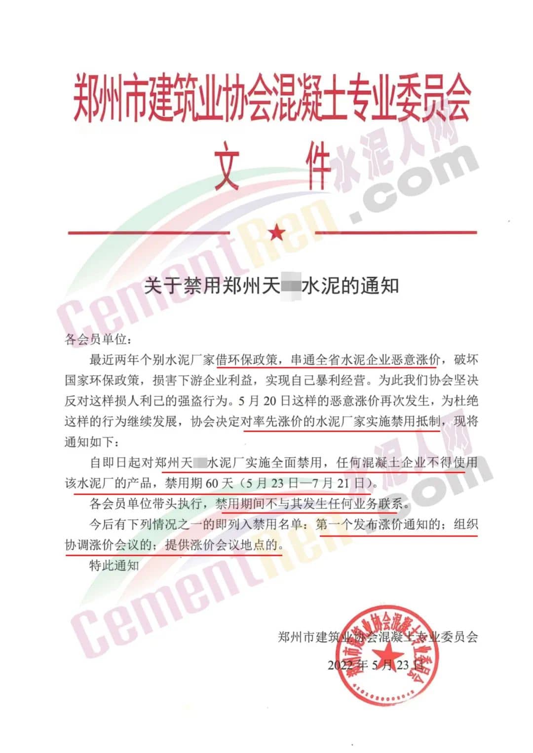 水泥人网通讯员消息,日前,郑州市建筑业协会混凝土专业委员会发布关于禁用河南某大型企业水泥产品的通知称:“最近两年个别水泥厂家借环保政策,串通全省水泥企业恶意涨价,破坏国家环保政策,损害下游企业利益,实现自己暴利经营。”