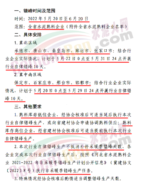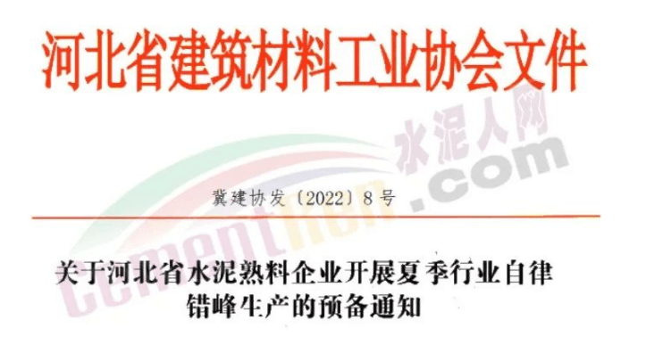 河北省建筑材料工业协会发布关于《河北省水泥熟料企业开展夏季行业自律错峰生产的通知》,通知要求分区域,5月20至6月10日,分区域每个企业最少停产10天。