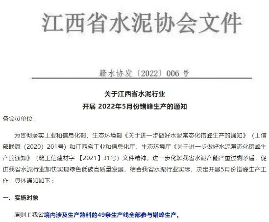 江西省发布关于水泥行业开展2022年5月份错峰生产的通知,要求江西省境内49条水泥熟料生产线5月10日00:00-5月19日24:00.错峰生产10天。