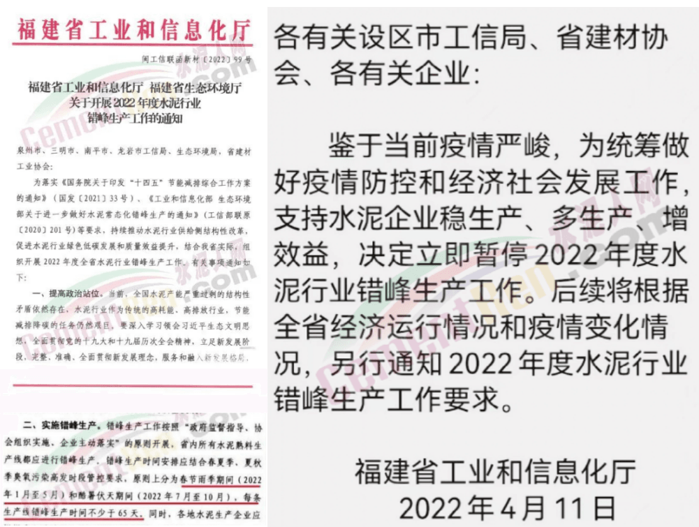 福建省与山东省类似,也是先发了错峰生产文件又通知暂停通知。福建省工信厅和福建省生态环境厅3月17日联合发布通知要求省内所有水泥熟料生产线酷暑伏天期间(2022年7月至10月),每条生产线错峰生产时间不少于65天。4月11日工信厅又通知为了支持水泥企业稳生产、多生产,增效益暂停错峰。