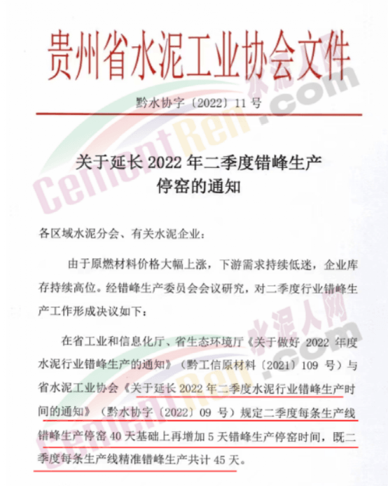 贵州省水泥工业协会发布通知称,因原燃材料价格上涨,下游需求低迷,企业库存持续高位,经研究决定延长错峰。要求贵州区域所有水泥熟料生产线二季度每条生产线精准错峰生产45天。