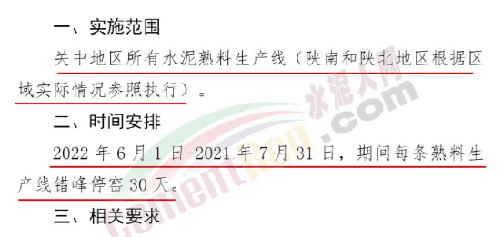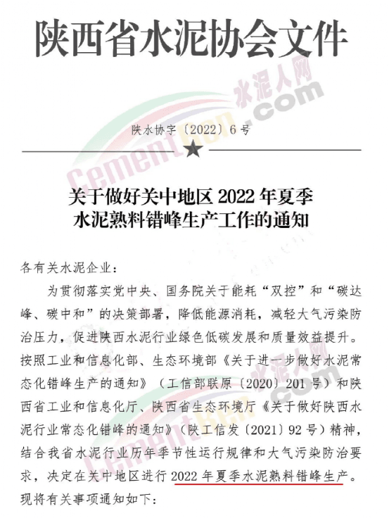 4月29日,陕西省水泥协会发布关于做好关中地区2022年夏季水泥熟料错峰生产工作的通知,要求关中地区所有水泥熟料生产线于2022年6月1日至7月31日期间错峰停窑30天/线。