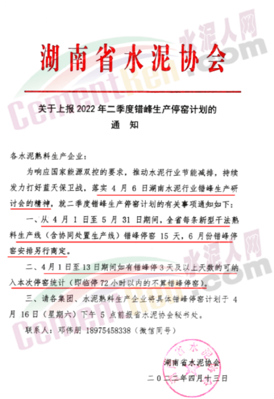 4月13日,湖南省水泥协会就发布《关于上报2022年二季度错峰生产停窑计划的通知》,其中就有提到湖南省水泥熟料生产线自4月1日至5月31日期间,错峰停窑15天。
