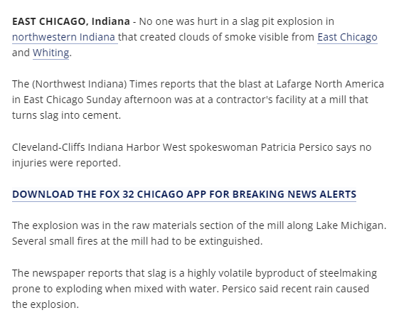 炉渣是炼钢的一种高度挥发性的副产品,与水混合时容易爆炸。据Persico称,可能是最近的降雨导致了这场爆炸。